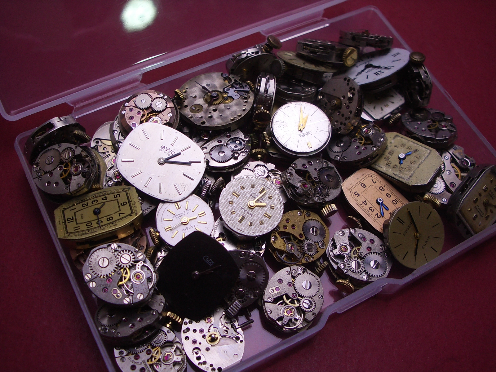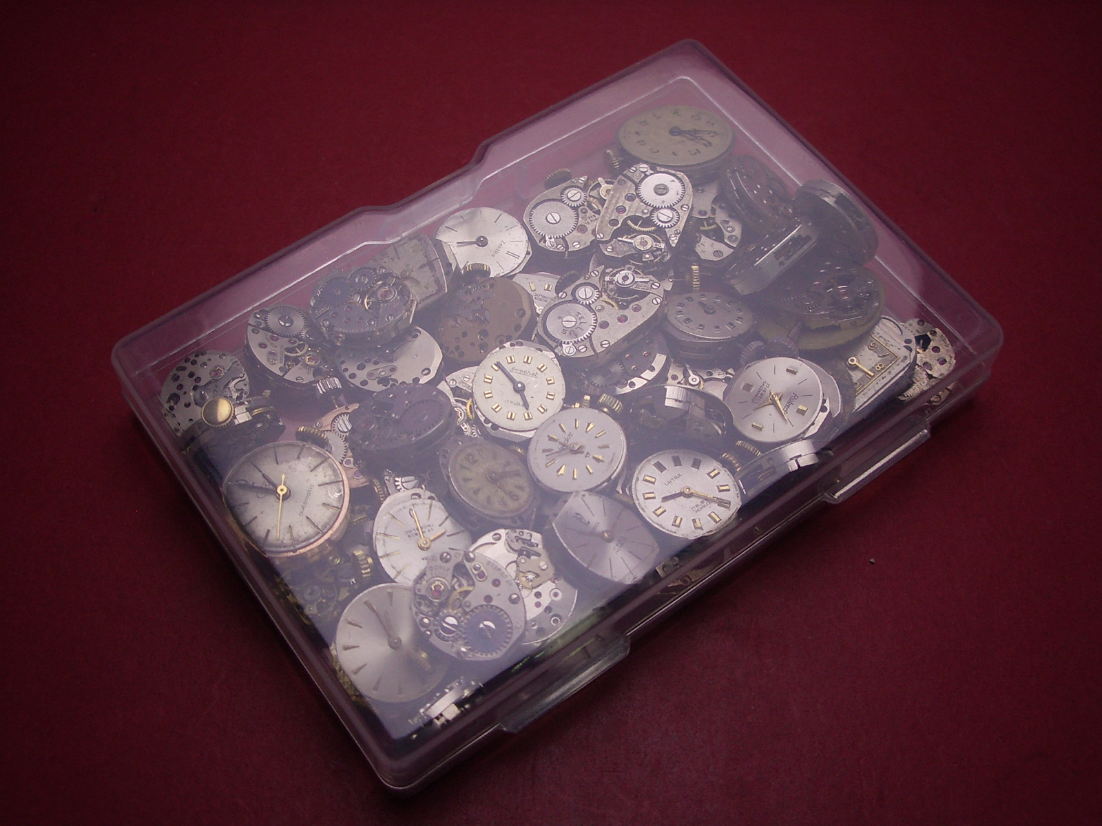 Konvolut mit 50 Damenuhrwerken ausgeschlachteter Golduhren, als Ersatz oder Ersatzteilträger geeignet