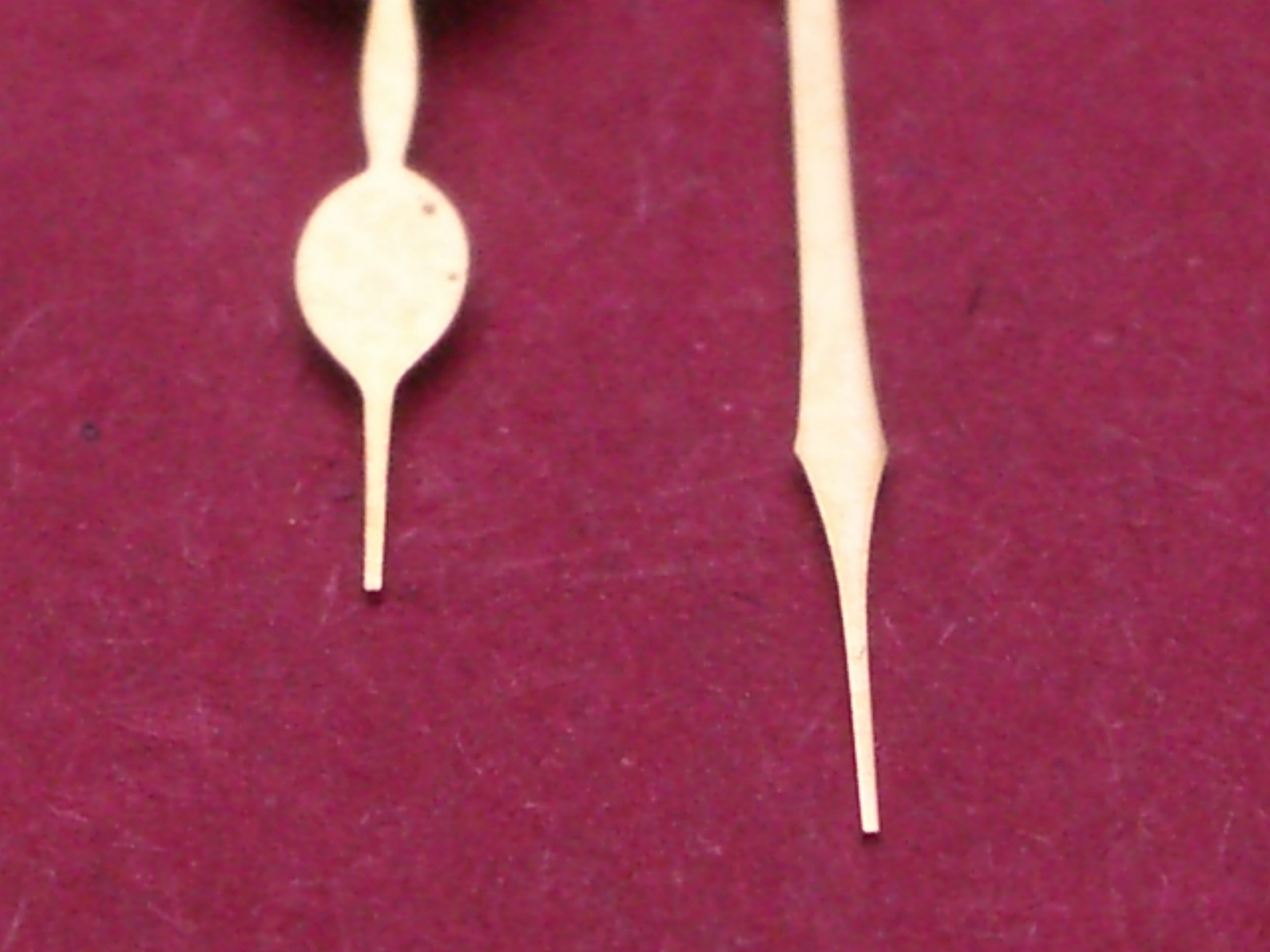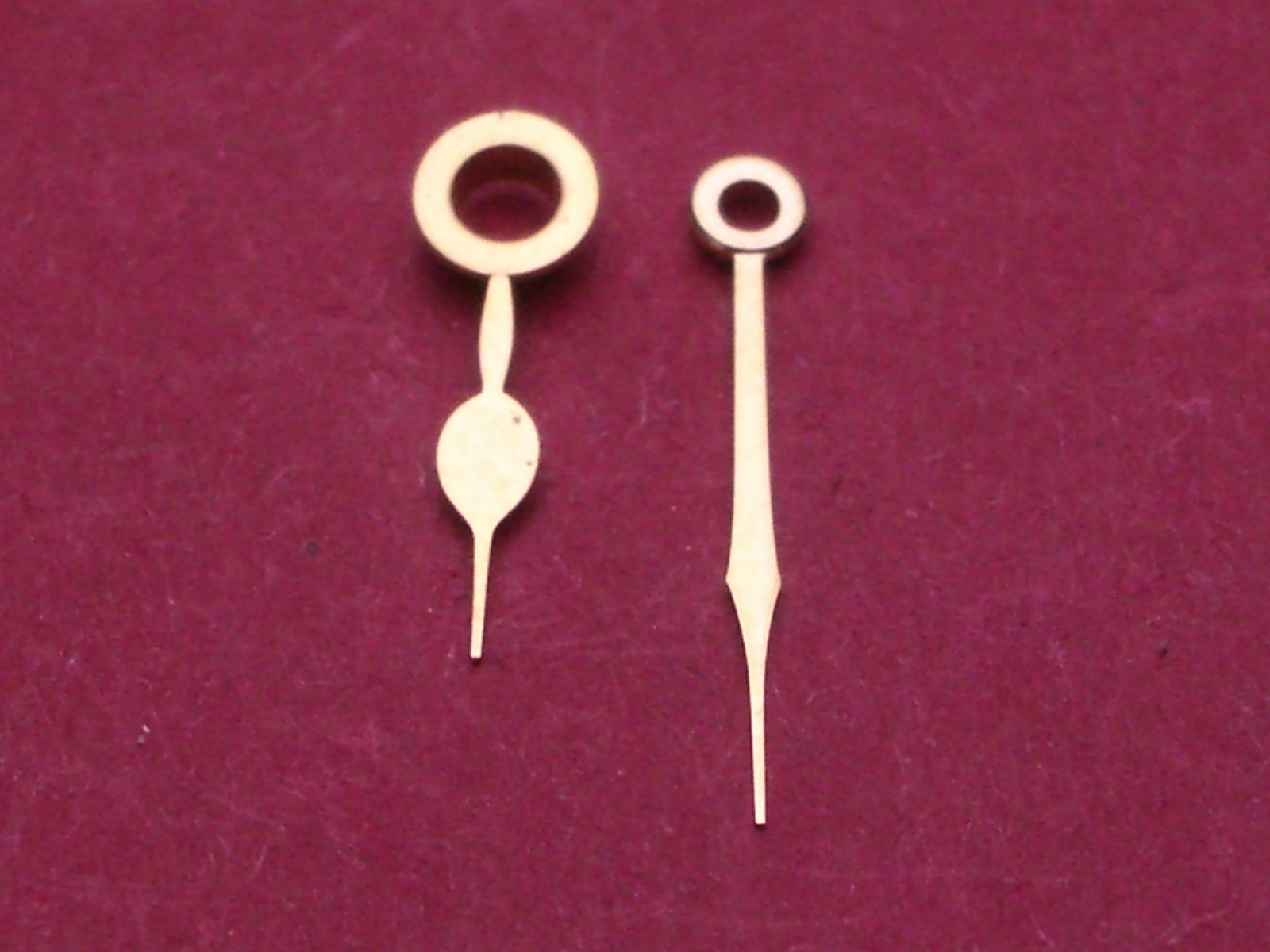 Taschenuhr-Zeiger gelb, Roskopf Poires Indes von 1967, Loch-Ø Std/Min 195/115, Länge Stundenzeiger: ca. 10,1mm, Länge Minutenzeiger ca. 13,1mm
