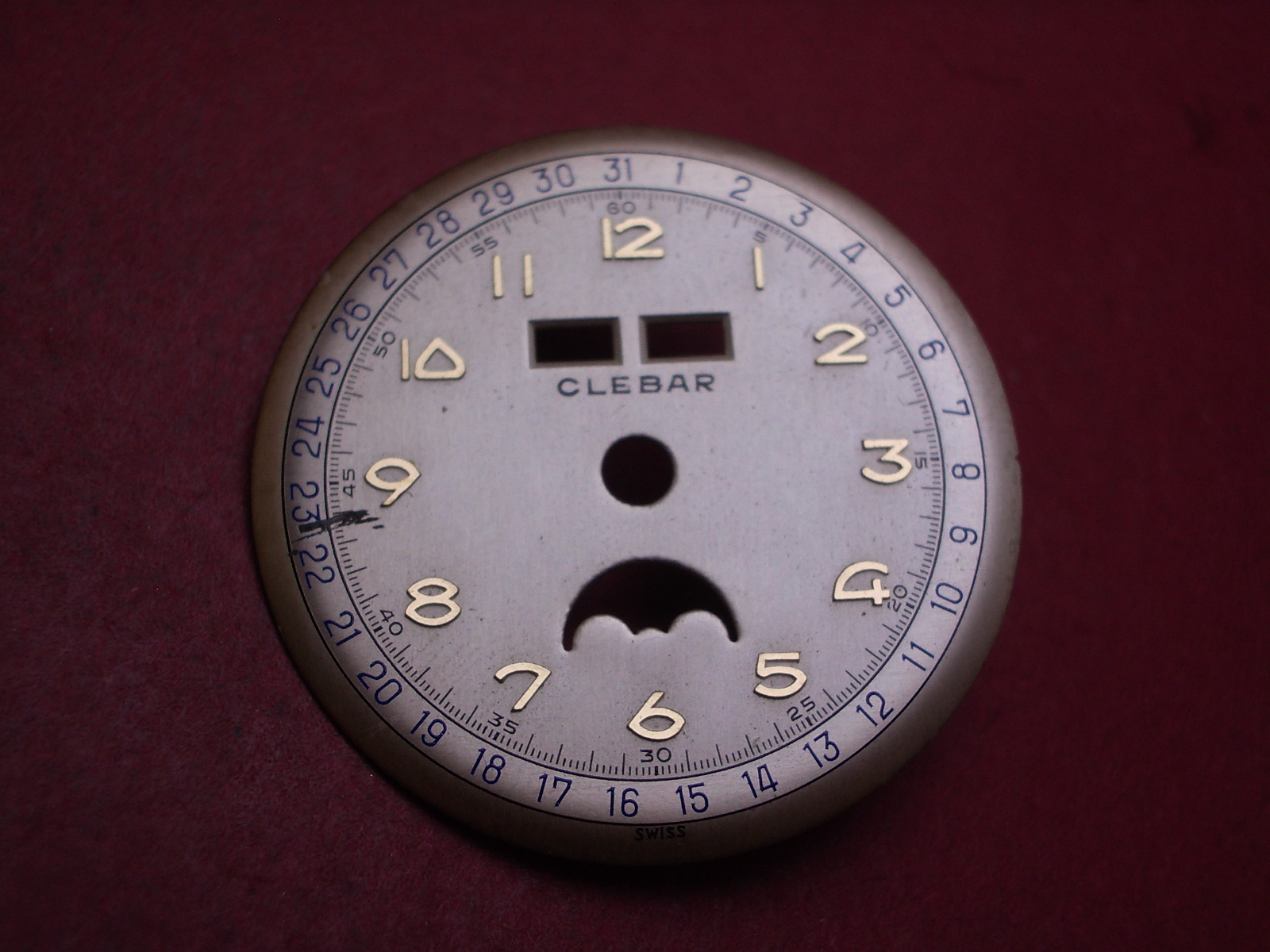 Venus Zifferblatt für Kal. 203 oder 204 (Basiskaliber 180), Ø 30,4mm, creme/gold/blau, "CLEBAR", NOS (New Old Stock)