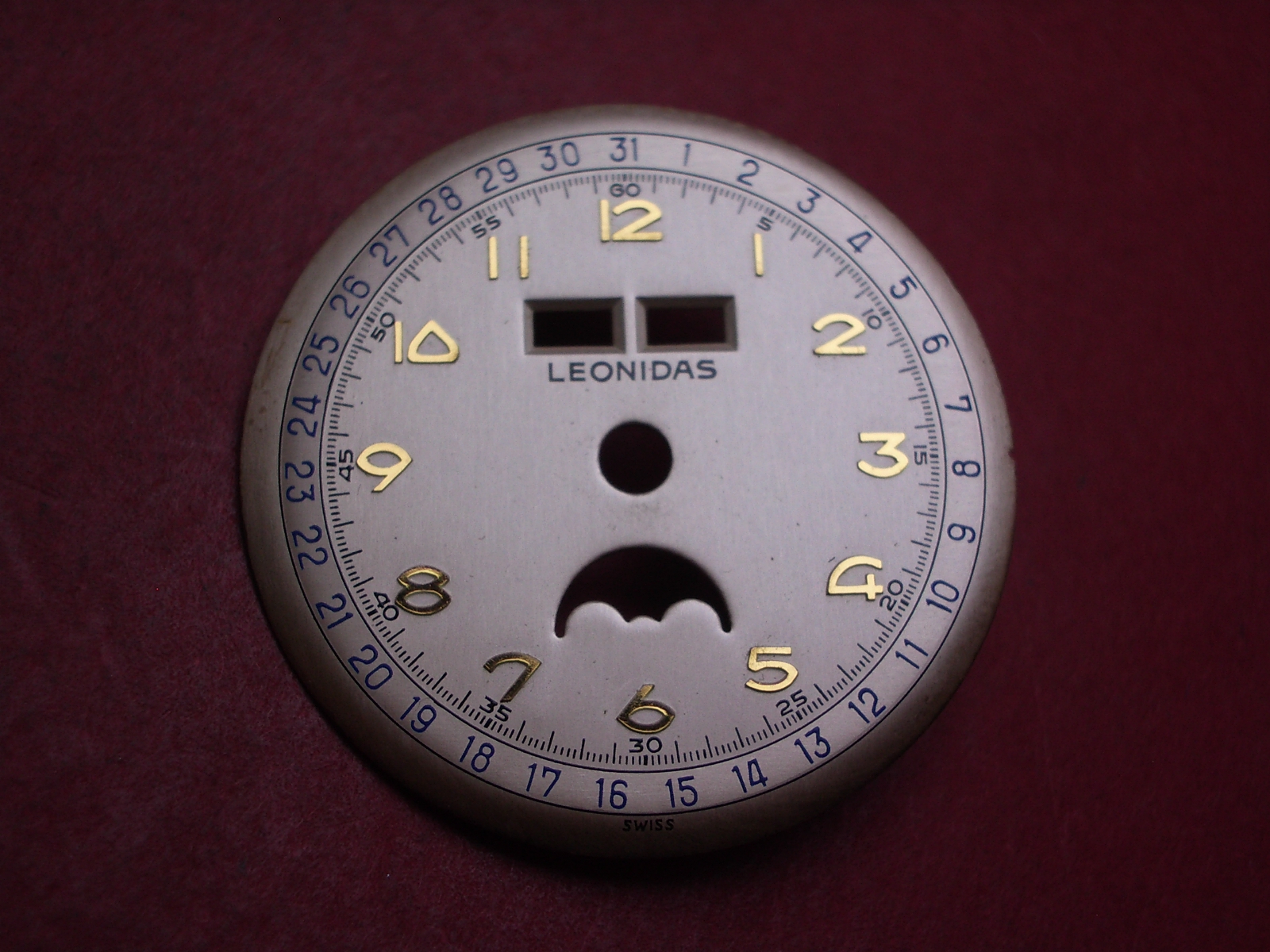 Venus Zifferblatt für Kal. 203 oder 204 (Basiskaliber 180), Ø 30,5mm, creme/gold/blau, "LEONIDAS", NOS (New Old Stock)